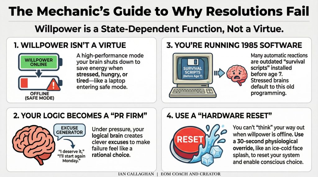 Executive Summary: Why do New Year’s resolutions fail with such statistical regularity? Traditional self-help suggests a lack of discipline, but the Emotional Operating System (EOM) framework identifies the failure as mechanical rather than moral. By understanding “System Tone,” bypassing “The Installation” of childhood programming, and using “Physiological Overrides,” individuals can move beyond the “Dry January” loop and achieve permanent identity updates. This 2,500-word guide breaks down the systems architecture of the human psyche, providing a technical manual for those tired of being “frustrated drivers” of their own lives.
