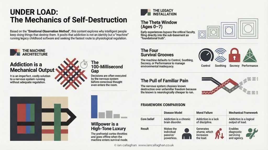 Ian Callaghan argues that addiction is not an identity; it is a mechanical response to a system running beyond its “Safe Working Load.” When a machine produces the wrong output, we don’t call it “evil” or “diseased”—we look at the inputs and the hardware conditions.