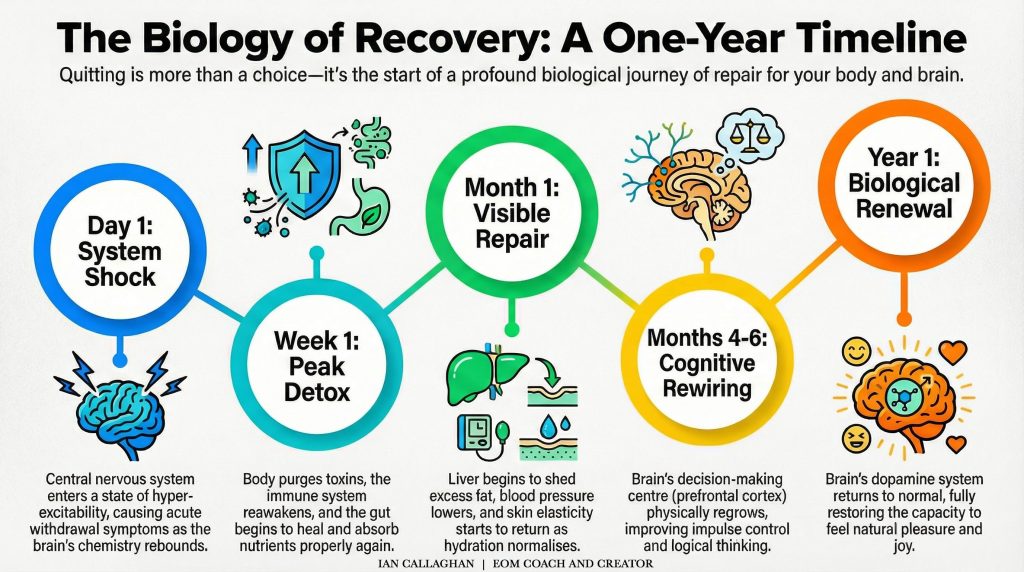 Biologically, the neural pathways for “coping” have physically changed. The automatic neural response to stress is no longer “seek substance” but has been overwritten by new synaptic pathways formed through twelve months of repetitive, healthy behaviours. This is neuroplasticity in its final, solidified form.